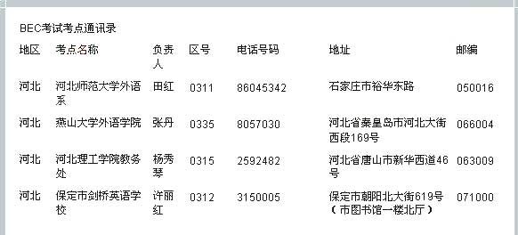 2011年BEC商务英语考试河北考点 2011年上半年BEC商务英语考试即将在五月开考,新东方在线特别汇总整理了BEC商务英语考试考点通讯录供广大考生参考查询。 BEC口语: BEC每日一句:提...