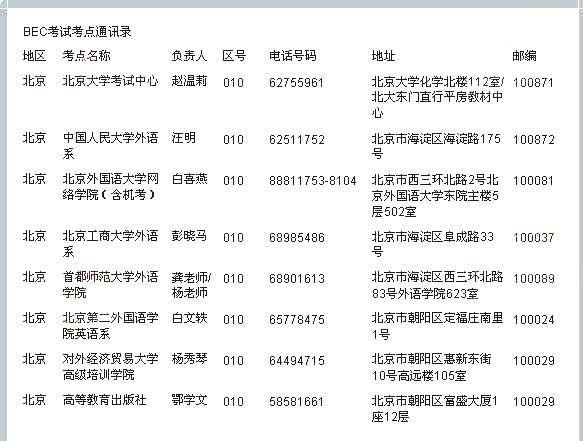 2011年BEC商务英语考试北京考点 2011年上半年BEC商务英语考试即将在五月开考,新东方在线特别汇总整理了BEC商务英语考试考点通讯录供广大考生参考查询。 BEC口语: BEC每日一句:提...