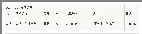 2011年BEC商务英语考试山西考点 2011年上半年BEC商务英语考试即将在五月开考,新东方在线特别汇总整理了BEC商务英语考试考点通讯录供广大考生参考查询。 BEC口语: BEC每日一句:提...